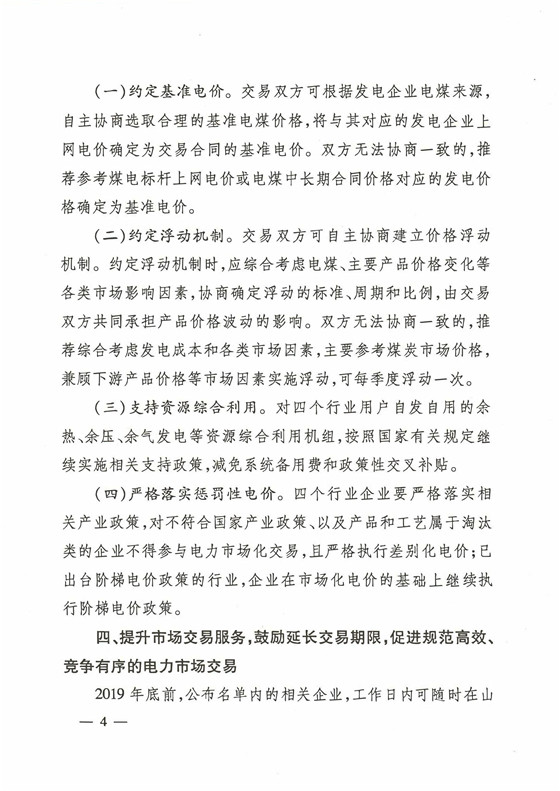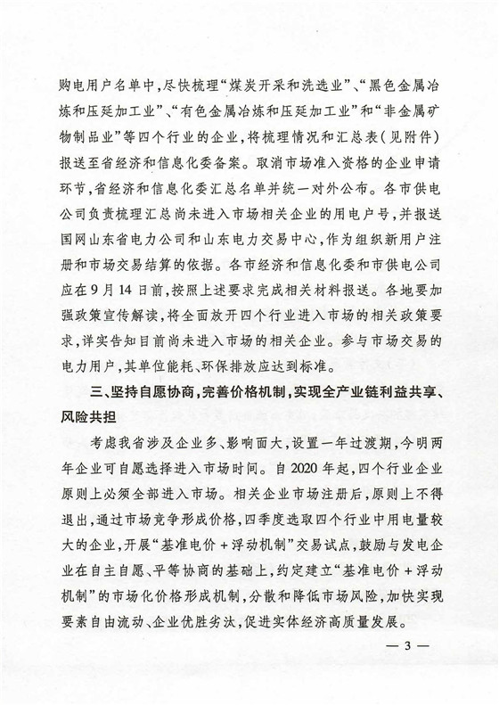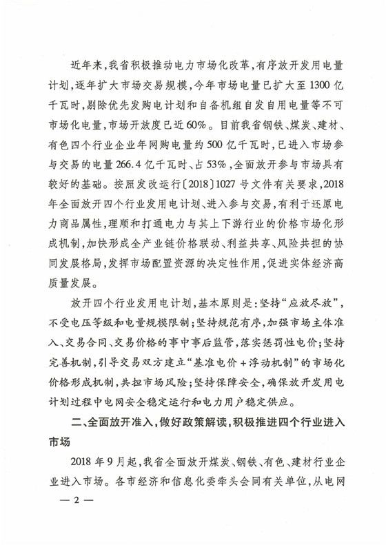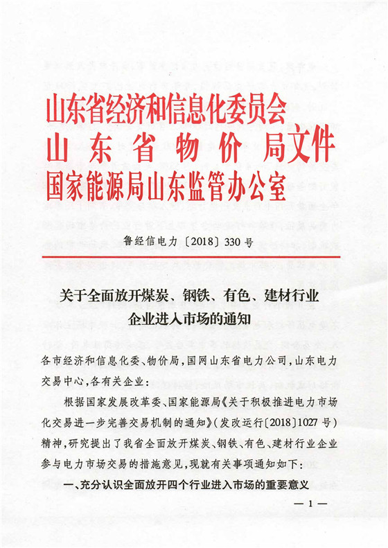 2018年 9月山東經(jīng)信委、物價(jià)局、能源局聯(lián)合發(fā)文《關(guān)于全面放開煤炭、冶金、有色、建材行業(yè)企業(yè)全面進(jìn)入市場(chǎng)的通知》(魯經(jīng)信電力【2018】330 號(hào)文);強(qiáng)制要求煤炭、鋼鐵、有色、建材四大行業(yè),2019年底必須納入市場(chǎng)化交易,否則將執(zhí)行懲罰電價(jià)。